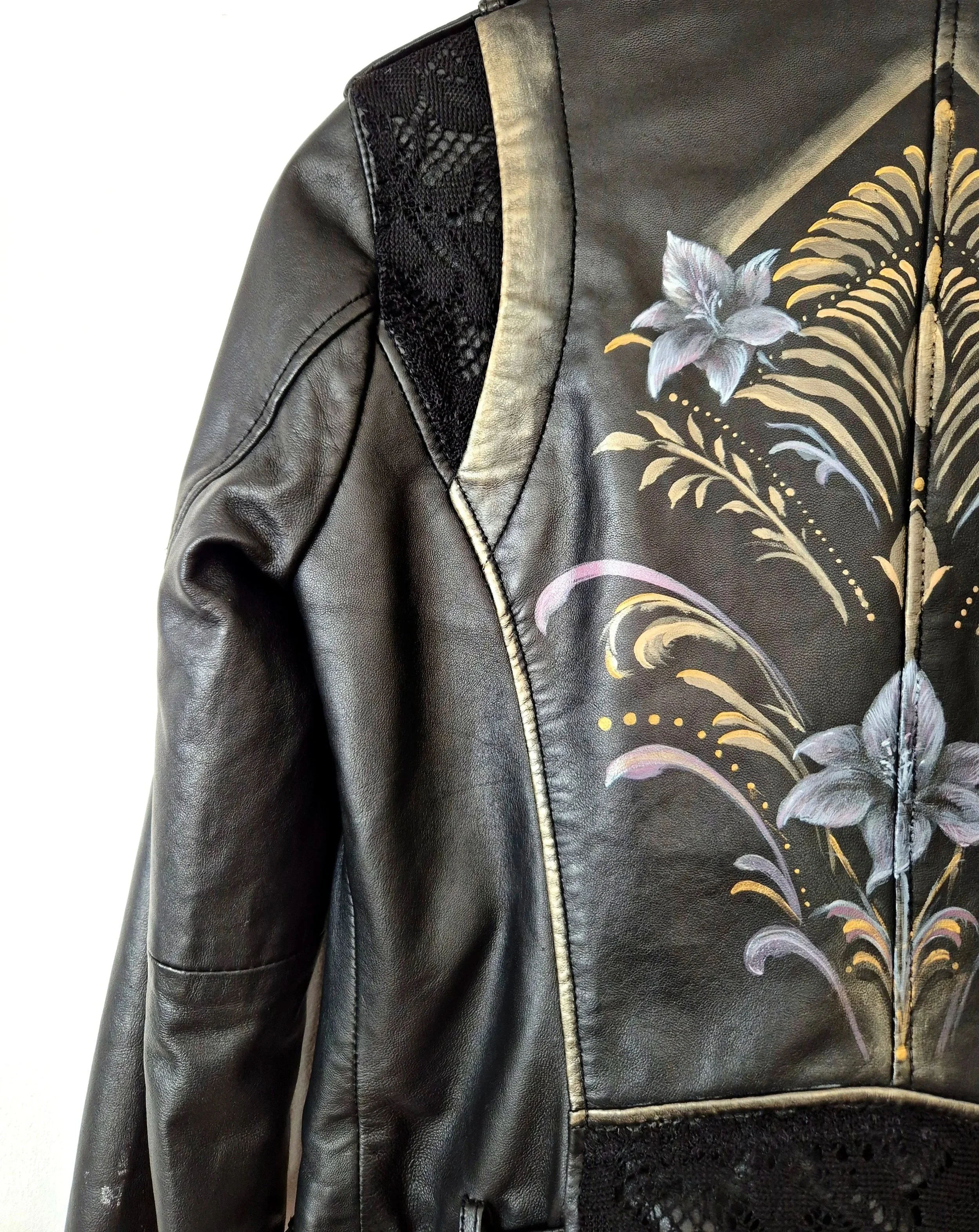 Hand painted black leather jackets, embodies the rebellion, designs are a play on tarot and symbolism.